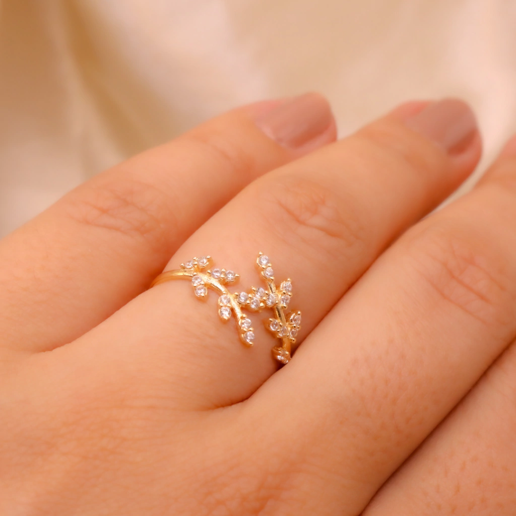 Uma joia que floresce em cada detalhe. O Anel Ramo de Brilho é feito em ouro 18K com ramificações delicadamente cravejadas com zircônias. Um design orgânico e elegante que simboliza renovação, crescimento e a beleza de seguir florescendo com leveza.